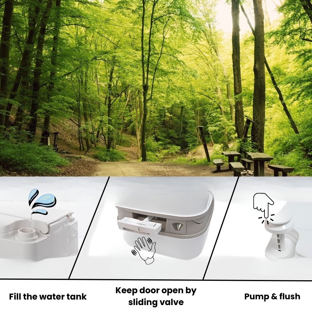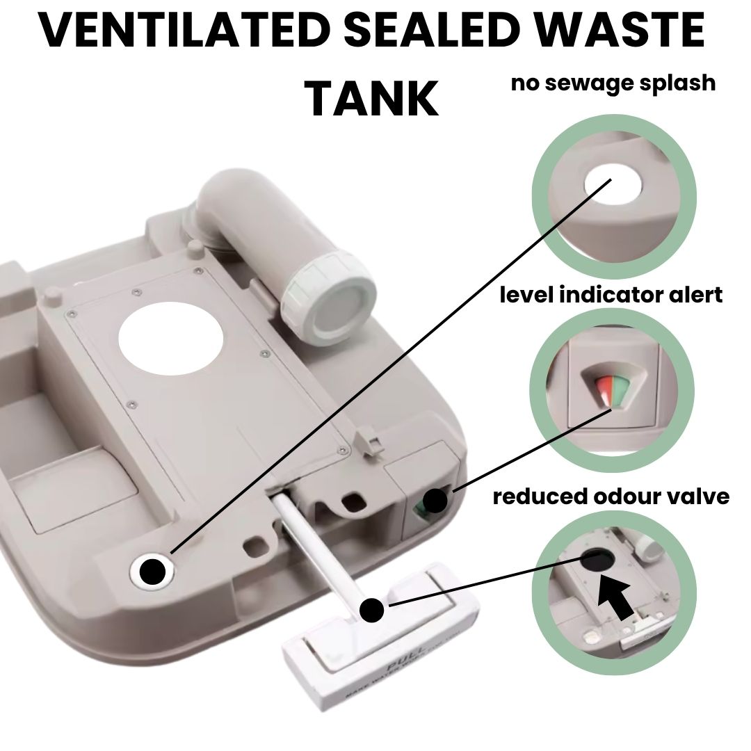 This camp toilet features a leak-proof waste tank with a water level indicator for timely disposal. The vent valve balances pressure to prevent overflow, while the push-pull sealed drain valve effectively reduces odors and leaks, ensuring a hygienic and convenient outdoor experience.